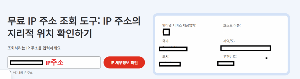 • 외부식별 IP주소 뿐만 아니라 내가 사용하는 인터넷 서비스 제공업체, 국가, 도시, 지역/도, 우편번호까지 세세하게 알려줍니다.
