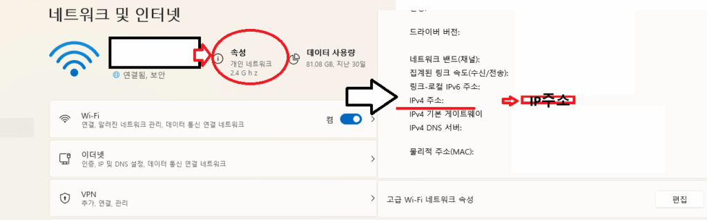 • 네트워크 속성 페이지 아래에 “IPv4”주소가 바로 내 컴퓨터의 IP주소입니다.