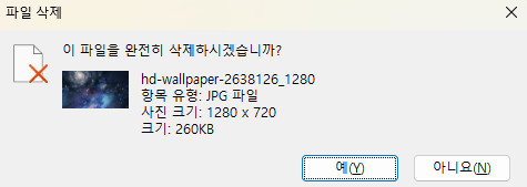 | Shift + Delete (영구 삭제) | 휴지통을 거치지 않고 바로 영구 삭제 됩니다. *Delete 키만 누르면 휴지통으로 이동합니다. | 삭제된 데이터는 복구가 불가능 하므로 정말 영구 삭제 해도 되는 것인지 확인 후 사용합니다. |