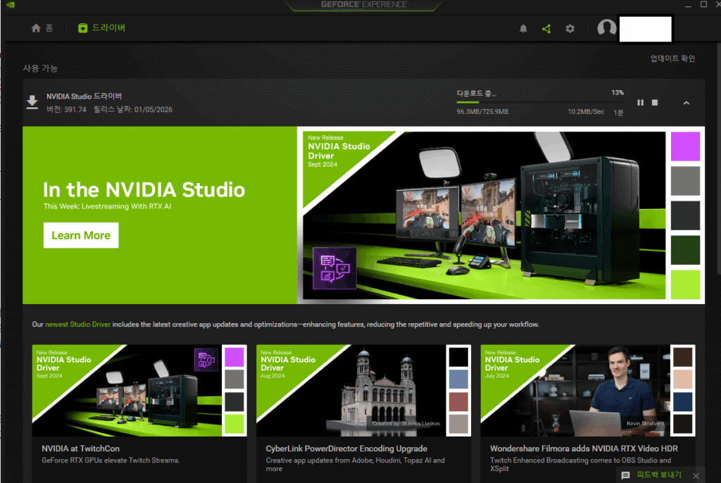 • 하지만 보통은 GeForce Experience, AMD Radeon Software와 같은 프로그램이 깔려 있어서 쉽게 업데이트 할 수 있습니다.