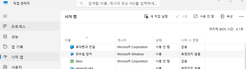 • 왼쪽 사이드바 메뉴에서 “시작 앱”탭으로 이동합니다.