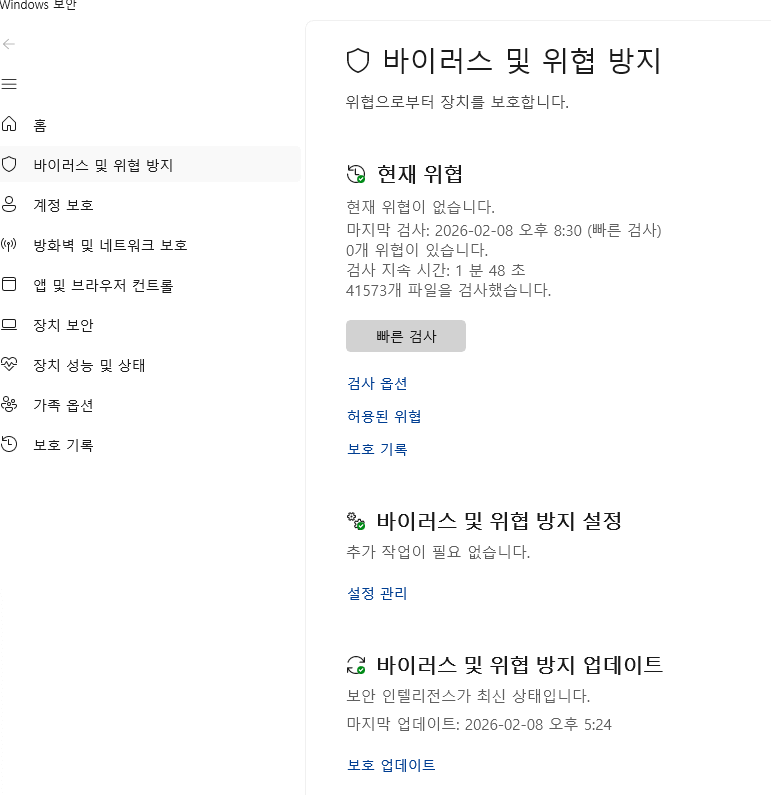 • “바이러스 및 위협 방지“탭으로 들어가 “현재 위협”을 스캔할 수 있습니다.