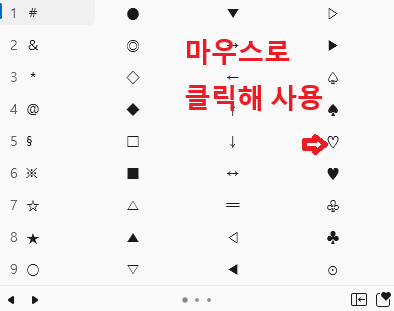 | <3 또는 ♥ 또는 ♡ | 하트 (ㅁ+한자 키를 동시에 누르면 하트기호 사용가능합니다.) |
